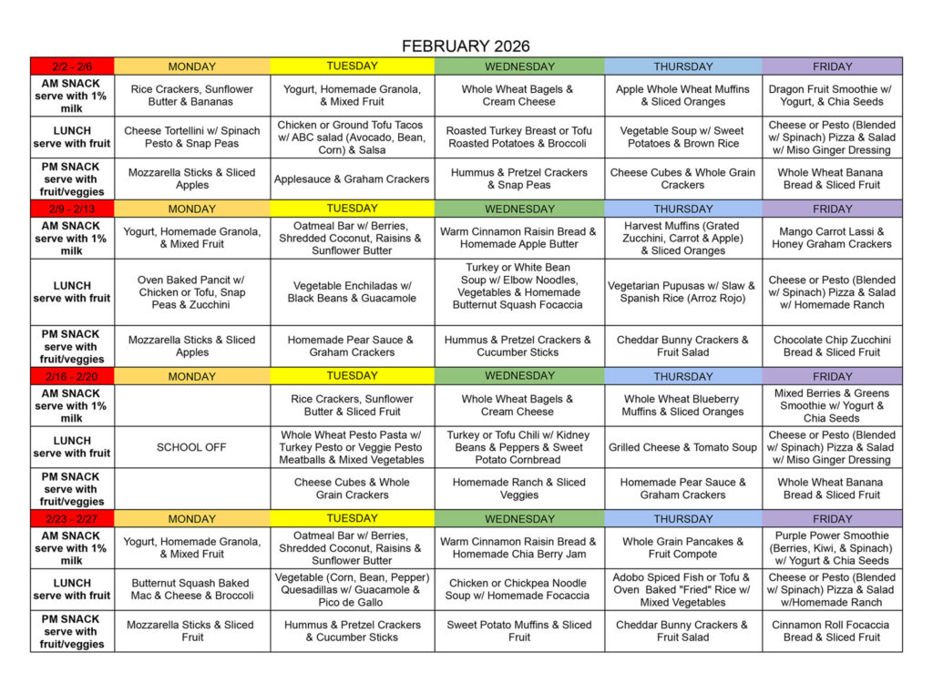 We serve snacks and lunch family-style so that children have the opportunity to sit with a teacher and greet/converse with their peers. We offer a variety of healthy snacks and lunches, and children who are vegetarian or on a specific diet can eat those foods alongside their friends.